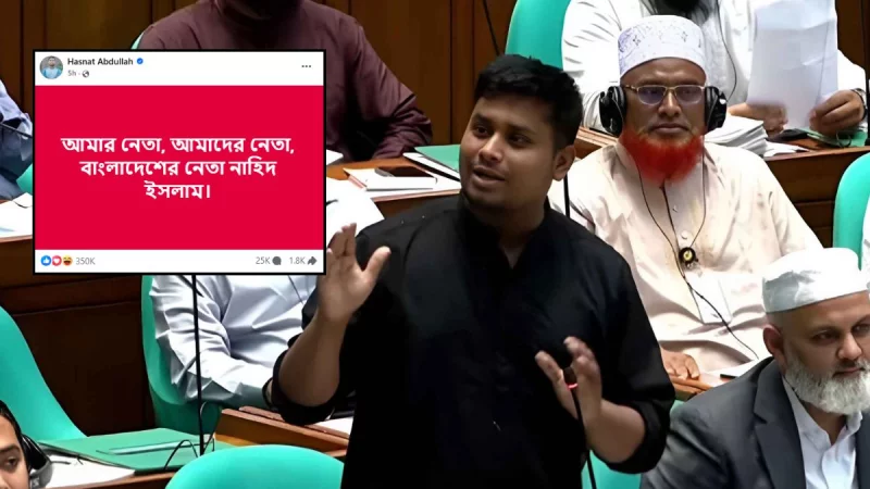 জাতীয় সংসদের বিরোধীদলীয় চিফ হুইপ এবং এনসিপির আহ্বায়ক নাহিদ ইসলামকে বাংলাদেশের নেতা বলে আখ্যা দিয়েছেন দলটির দক্ষিণাঞ্চলের মুখপাত্র ও কুমিল্লা-৪ আসনের এমপি হাসনাত আবদুল্লাহ। বৃহস্পতিবার (৩০ এপ্রিল) দুপুরে নিজের ভেরিফায়েড ফেসবুক আইডি থেকে দেওয়া এক পোস্টে তিনি এ কথা বলেন। পোস্টে হাসনাত লিখেন, ‘আমার নেতা, আমাদের নেতা, বাংলাদেশের নেতা নাহিদ ইসলাম।’ এদিকে এই পোস্ট দেওয়ার পরপরই সেটি সামাজিক যোগাযোগমাধ্যমে ছড়িয়ে পড়ে। এর কয়েক ঘণ্টা পর সংসদে নাহিদের দেওয়া একটি বক্তব্যের ভিডিও প্রকাশ করে একই ক্যাপশন লেখেন হাসনাত। হাসনাতের পোস্ট করা ভিডিওতে দেখা যায়, নাহিদ ইসলাম সংসদে বক্তব্য দিচ্ছেন। ৩৩ মিনিটের সেই ভিডিও ইতোমধ্যে ভাইরাল হয়েছে। এদিকে এই প্রতিবেদন লেখা পর্যন্ত পোস্টে ৩ লাখ ৫০ হাজারেরও বেশি লাইক পড়েছে।Published: প্রকাশ : ৩০ এপ্রিল ২০২৬, ১৯:০৮