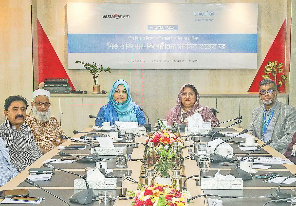 দক্ষ জাতি গঠনে শিশুদের মানসিক স্বাস্থ্য বিকাশে নজর দিতে হবে। পাঠ্যক্রমে স্বাস্থ্য বিষয় অন্তর্ভুক্ত করা এবং শিক্ষকদের প্রশিক্ষণ দেওয়ার মাধ্যমে স্কুল পর্যায় থেকে শিশু, কিশোর–কিশোরীদের জন্য মানসিক স্বাস্থ্যসেবা চালু করা জরুরি। পাশা���াশি শিশুর মানসিক স্বাস্থ্য সুরক্ষায় অভিভাবকদের সচেতন হতে হবে। এতে শিশু–কিশোরদের মধ্যে আত্মহত্যার প্রবণতাও কমবে। ইউনিসেফ ও প্রথম আলো আয়োজিত গোলটেবিল বৈঠকে এ কথাগুলো উঠে আসে। গতকাল মঙ্গলবার রাজধানীর কারওয়ান বাজারে প্রথম আলো কার্যালয়ে ‘শিশু ও কিশোর–কিশোরীদের মানসিক স্বাস্থ্যের যত্ন’ শিরোনামে এ গোলটেবিল বৈঠক অনুষ্ঠিত হয়। ২৩ এপ্রিল ‘বিশ্ব শৈশব ও কৈশোর মানসিক স্বাস্থ্য দিবস’ উপলক্ষে এ আয়োজন করা হয়। জাতীয় মানসিক স্বাস্থ্য ইনস্টিটিউট ও হাসপাতালের পরিচালক অধ্যাপক সাইফুন নাহার বলেন, একটি শিশু পৃথিবীতে আসার পর তার সঙ্গে পরিবারের সদস্যদের সংযুক্ততা তৈরি না হলে শিশুটি মানসিক স্বাস্থ্য সমস্যায় ভুগতে পারে। শিশুদের মানসিক স্বাস্থ্য বিকাশে শিশুর ধরন, বয়স ও আর্থসামাজিক পরিবেশ বিবেচনায় সন্তান লালন–পালন (প্যারেন্টিং) করতে হবে। মানসিক স্বাস্থ্যসেবার কৌশল ও নির্দেশিকা আরও শক্তিশালী করা, বাজেট ও চিকিৎসাঘাটতি কমানো, মানসিক স্বাস্থ্যসেবা দিতে অনলাইন প্ল্যাটফর্ম ব্যবহারের ওপর জোর দেন তিনি। বাংলাদেশ মেডিকেল বিশ্ববিদ্যালয়ের (বিএমইউ) মনোরোগবিদ্যা বিভাগের অধ্যাপক নাহিদ মাহজাবিন মোরশেদ বলেন, অভিভাবকেরা সন্তানের যত্ন নেন না, তা নয়। তবে প্যারেন্টিং একটি বৈজ্ঞানিক পদ্ধতি। সন্তানকে বোঝার চেষ্টা করতে হবে, যাতে তার মানসিক সমস্যা তৈরি না হয়। সন্তানকে যথাযথভাবে পালন করে সুস্থ মস্তিষ্কের মানুষ হিসেবে গড়ে তুলতে হবে। মানসিক স্বাস্থ্য সহযোগিতা পেলে একটি দেশে সুস্থ ও দক���ষ জনগোষ্ঠী গড়ে ওঠে। জাতীয় মানসিক স্বাস্থ্য ইনস্টিটিউট ও হাসপাতালের সাবেক পরিচালক মো. মাহবুবুর রহমান বলেন, মানসিক স্বাস্থ্য সমস্যায় ভোগেন, এমন ব্যক্তিদের মধ্যে ৯৪ শতাংশই চিকিৎসার আওতায় থাকেন না। যথাযথ চিকিৎসার বিষয়কে সবচেয়ে অগ্রাধিকার দিতে হবে। এ ছাড়া স্বাস্থ্য বাজেটের মাত্র শূন্য দশমিক ৪ শতাংশ মানসিক স্বাস্থ্য খাতে ব্যয় হয়। এ বাজেট বাড়ানো দরকার। স্কুলে স্বাস্থ্য বলতে শুধু ভিটামিন ও কৃমির ওষুধ খাওয়ানো নয়, মানসিক স্বাস্থ্যকেও অন্তর্ভুক্ত করতে হবে। অনুষ্ঠানে মূল প্রবন্ধ উপস্থাপন করেন ইউনিসেফ বাংলাদেশের স্বাস্থ্য ব্যবস্থাপক দেওয়ান মো. ইমদাদুল হক। তিনি জানান, দেশে মানসিক স্বাস্থ্য রোগে ভুগছে ১৮ শতাংশের বেশি মানুষ। শিশুদের মধ্যে এ হার প্রায় ১৪ শতাংশ। ১০ থেকে ২৪ বছর বয়সী শিশু ও তরুণদের মধ্যে প্রায় ৫ শতাংশের আত্ম
